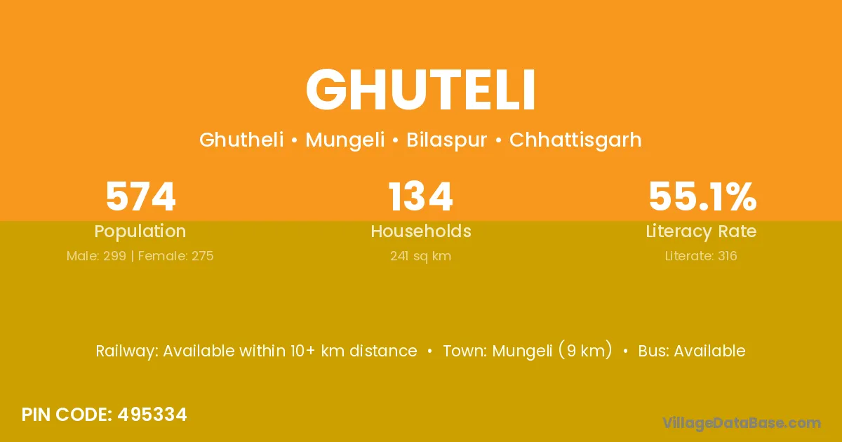 Mungeli (9 km) is the nearest town to Ghuteli village for major economic activities and is located approximately 9 km away.