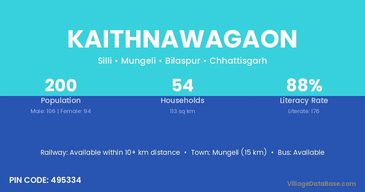 Mungeli (15 km) is the nearest town to Kaithnawagaon village for major economic activities and is located approximately 15 km away.