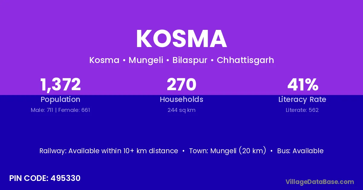 Mungeli (20 km) is the nearest town to Kosma village for major economic activities and is located approximately 20 km away.