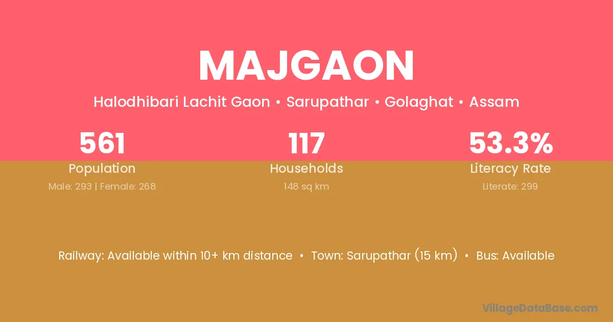 The literacy rate of Majgaon village is 60.38%. Male literacy stands at 66.45% and female literacy at 54.66%.