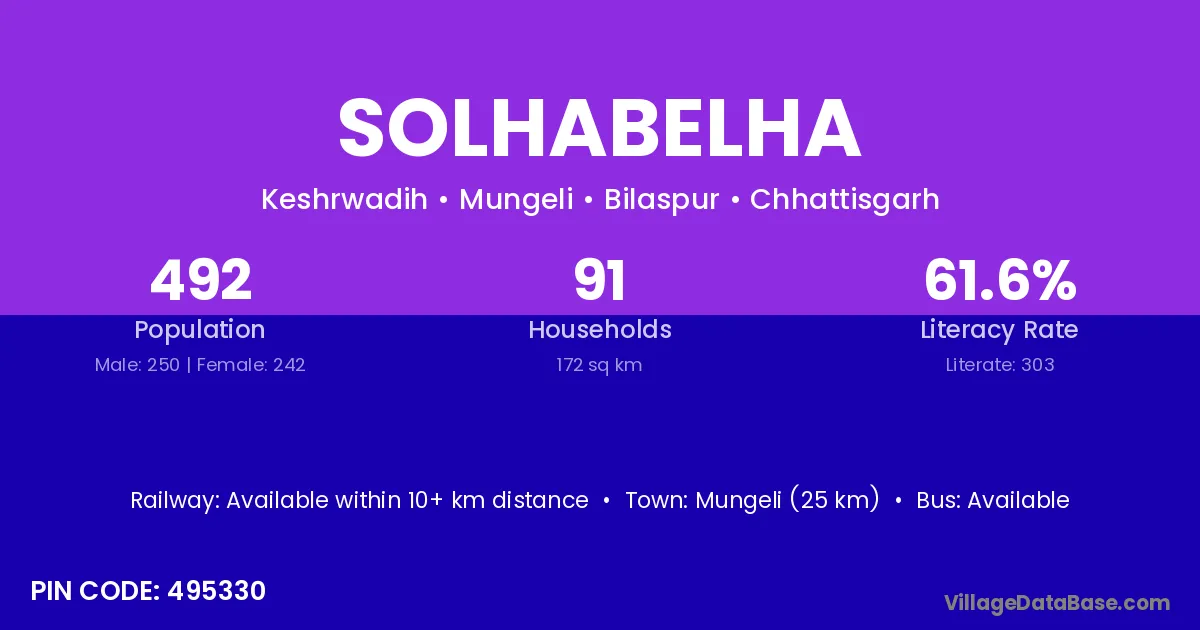 Solhabelha village has a total population of 492 people, of which 250 are males and 242 are females.