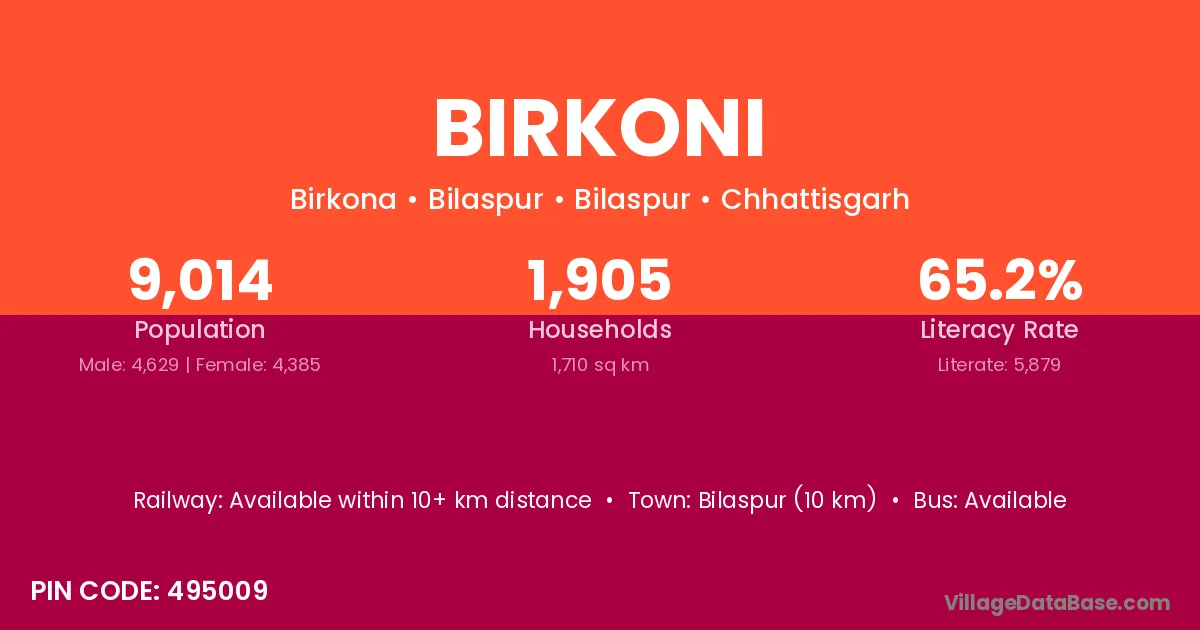 Birkoni village is located in the Pathariya Tehsil of the Bilaspur district in Chhattisgarh .