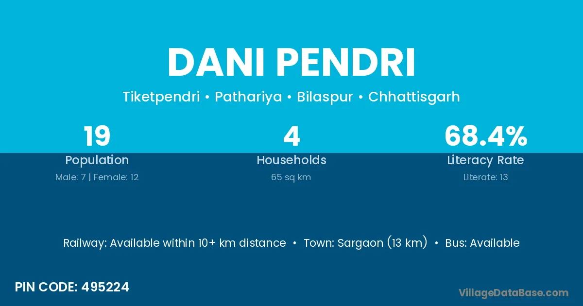 Sargaon (13 km) is the nearest town to Dani Pendri village for major economic activities and is located approximately 13 km away.