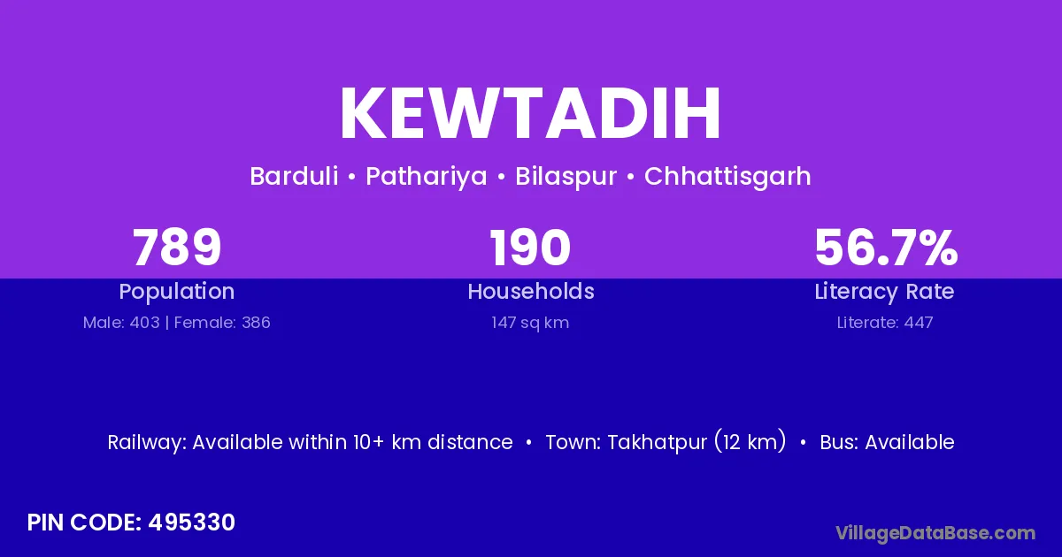 Takhatpur (12 km) is the nearest town to Kewtadih village for major economic activities and is located approximately 12 km away.