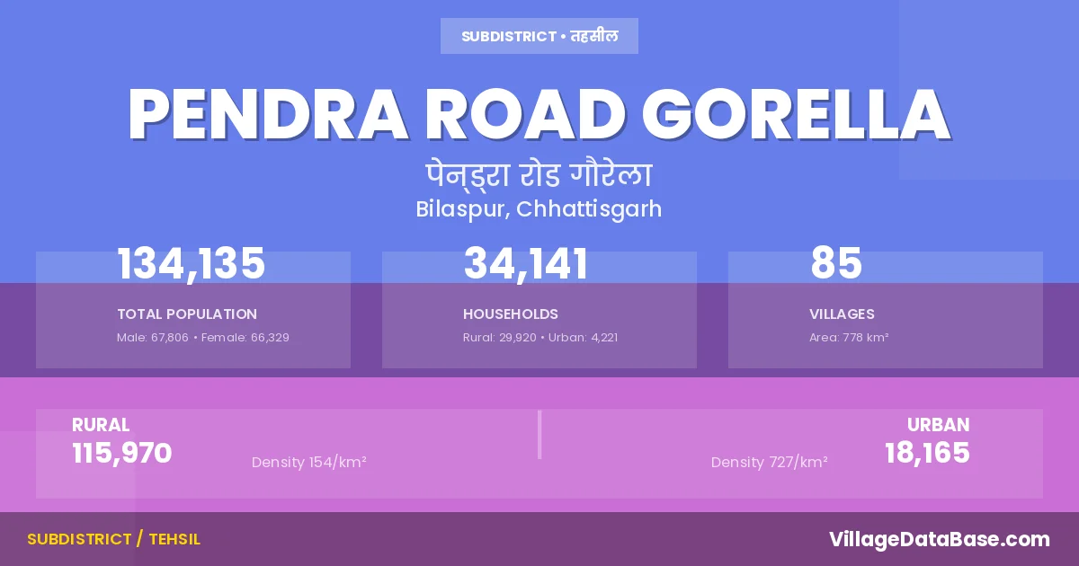 According to the 2011 census The total area of Pendra Road Gorella Tehsil is 778 km², with a population of 134135 people. The population density is 172 inhabitants per square kilometre, and there are approximately 34141 houses in the sub district.