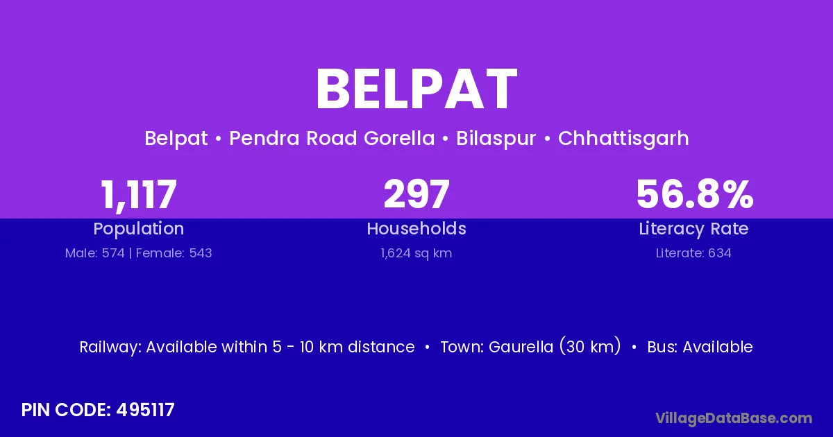 Gaurella (30 km) is the nearest town to Belpat village for major economic activities and is located approximately 30 km away.