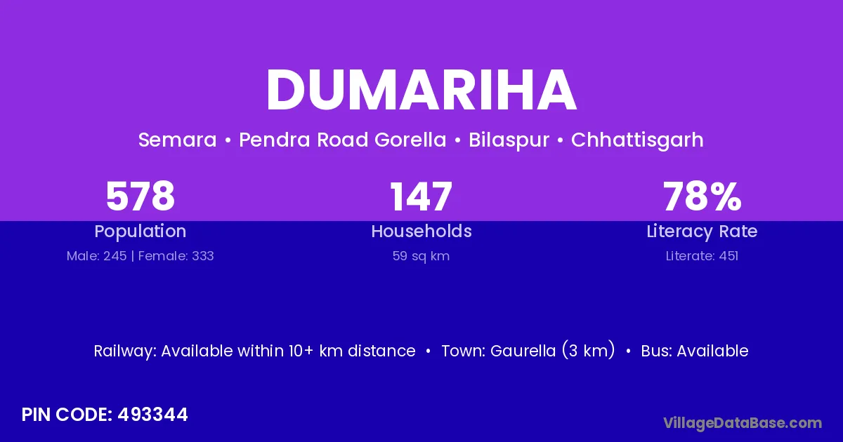 Gaurella (3 km) is the nearest town to Dumariha village for major economic activities and is located approximately 3 km away.