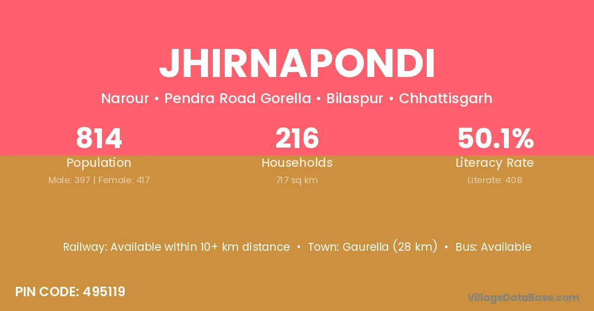 Gaurella (28 km) is the nearest town to Jhirnapondi village for major economic activities and is located approximately 28 km away.