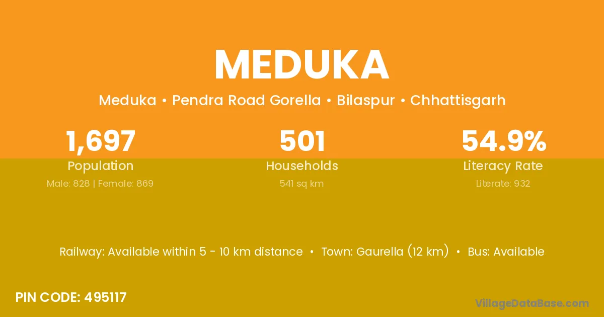 Gaurella (12 km) is the nearest town to Meduka village for major economic activities and is located approximately 12 km away.