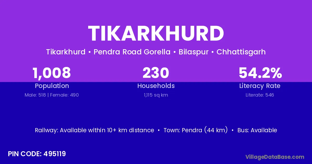 Pendra (44 km) is the nearest town to Tikarkhurd village for major economic activities and is located approximately 44 km away.