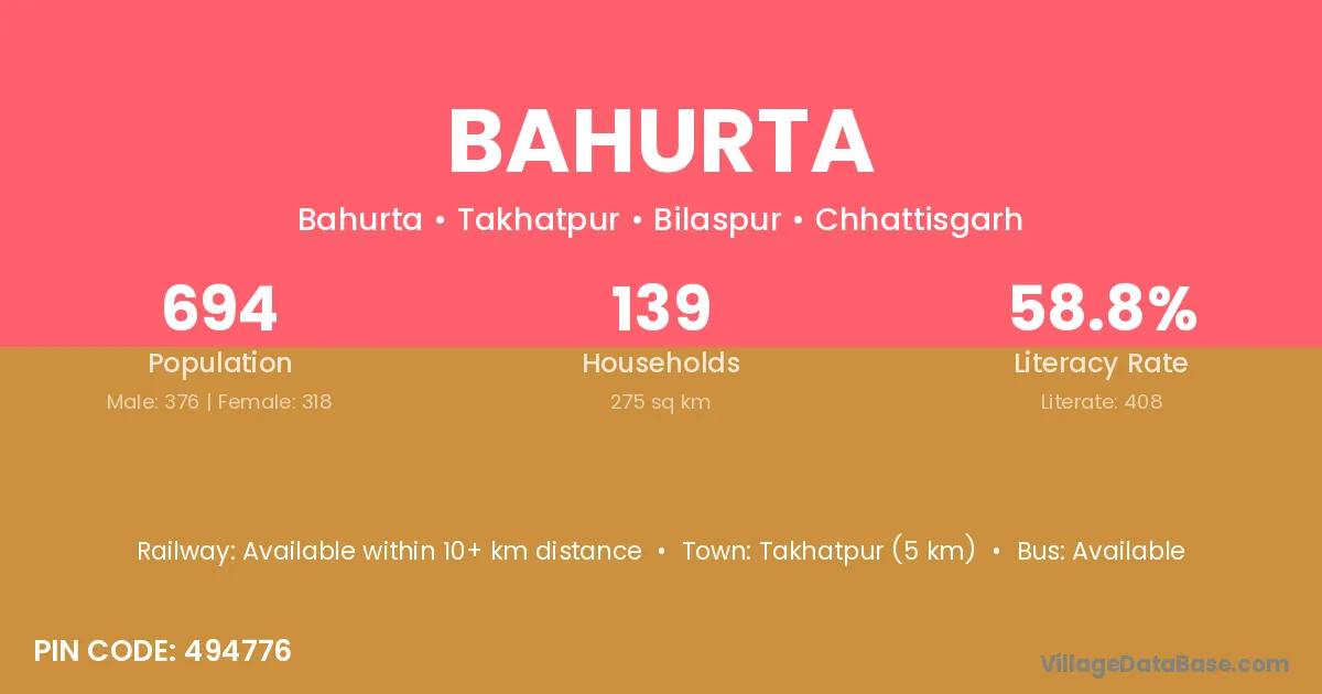 Takhatpur (5 km) is the nearest town to Bahurta village for major economic activities and is located approximately 5 km away.