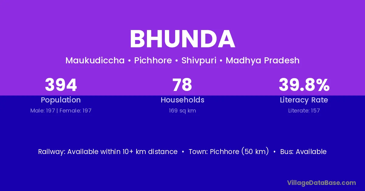 The literacy rate of Bhunda village is 63.25%. Male literacy stands at 71.49% and female literacy at 53.83%.