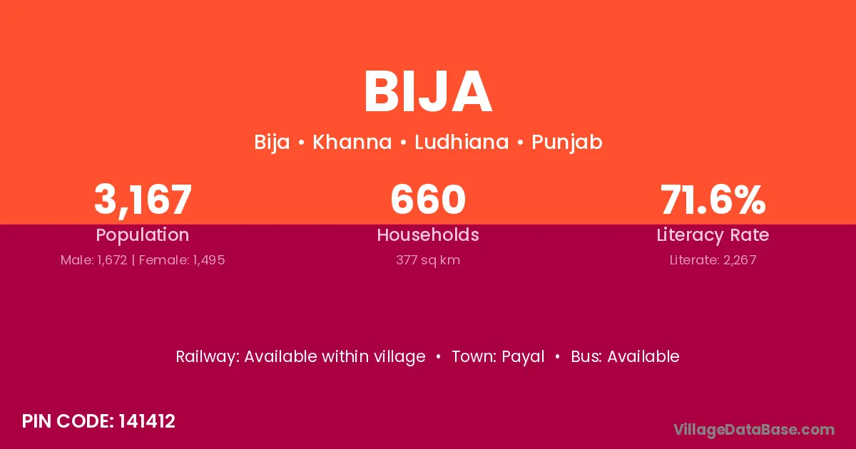The literacy rate of Bija village is 58.81%. Male literacy stands at 69.92% and female literacy at 47.22%.