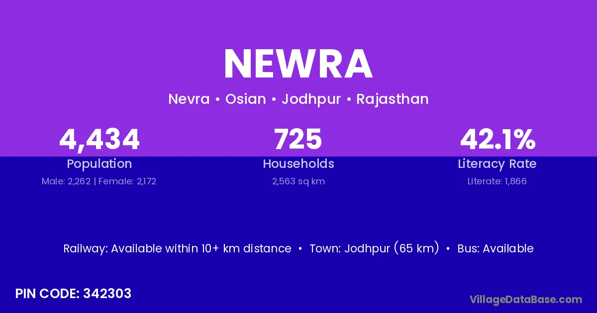 Newra village has a total population of 3,858 people, of which 1,959 are males and 1,899 are females.