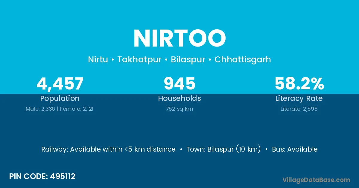 Bilaspur (10 km) is the nearest town to Nirtoo village for major economic activities and is located approximately 10 km away.