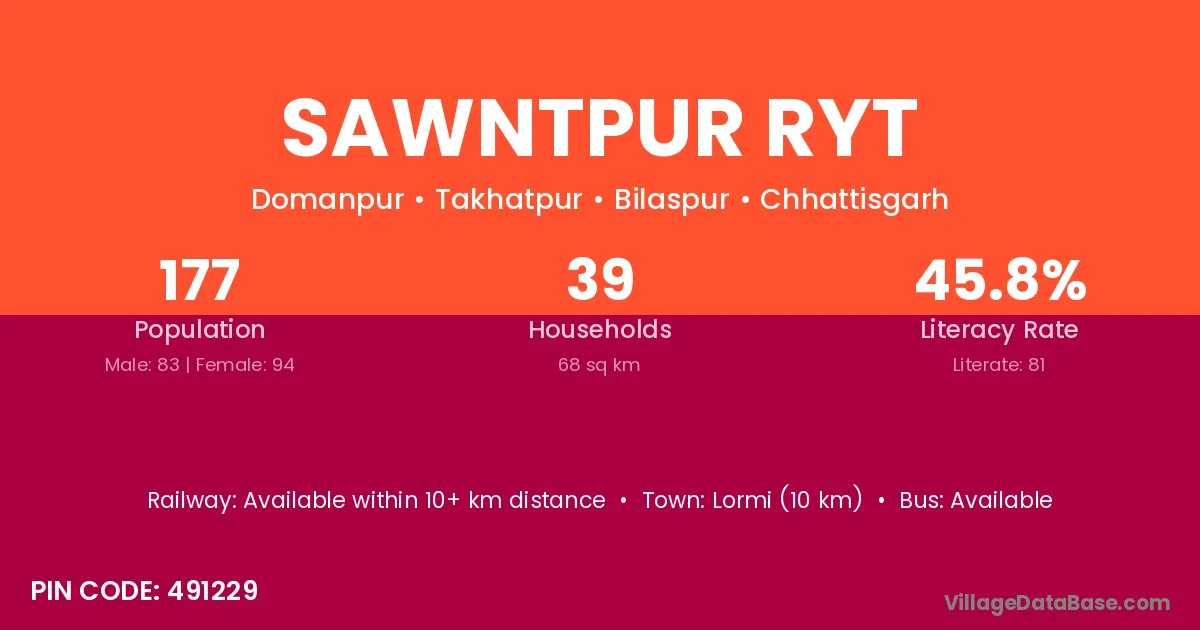 Lormi (10 km) is the nearest town to Sawntpur Ryt village for major economic activities and is located approximately 10 km away.