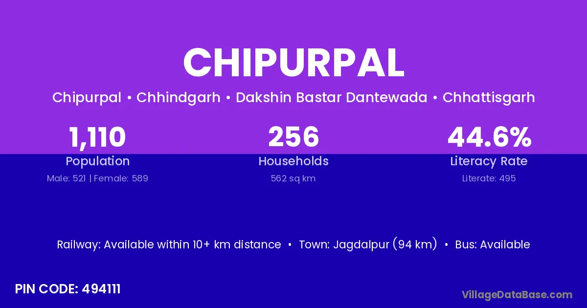 Jagdalpur (94 km) is the nearest town to Chipurpal village for major economic activities and is located approximately 94 km away.