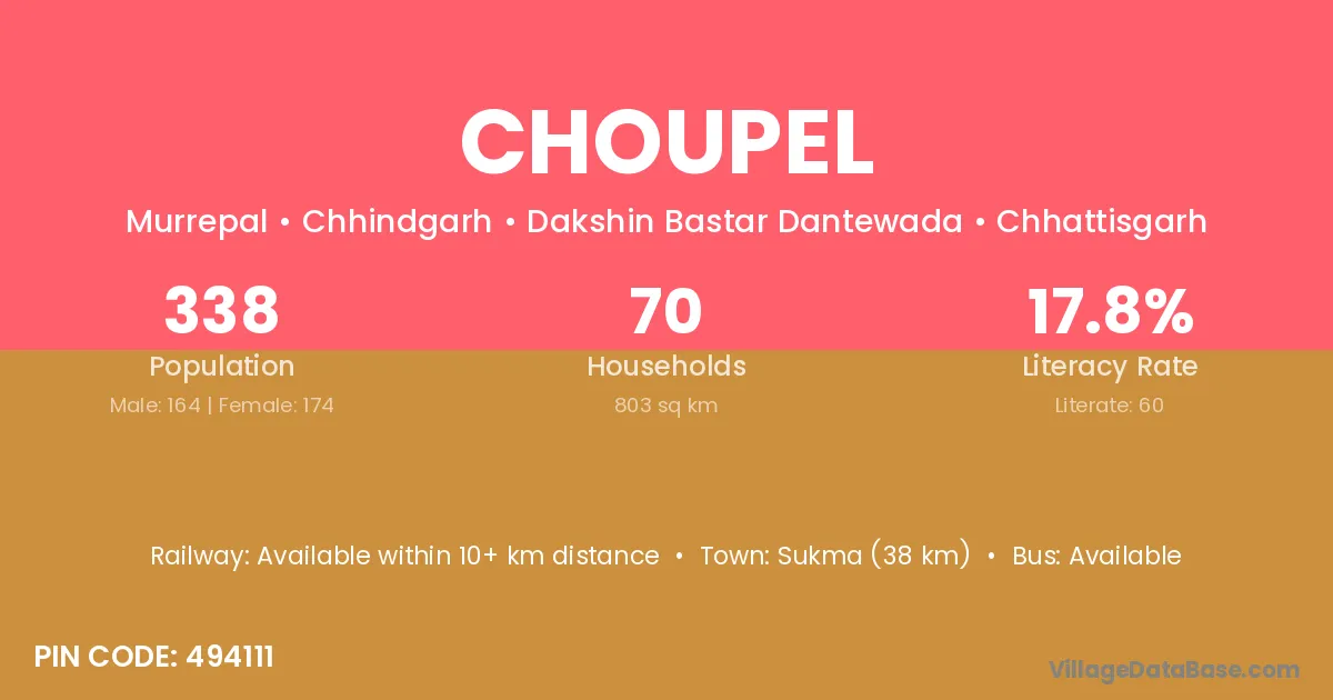 Sukma (38 km) is the nearest town to Choupel village for major economic activities and is located approximately 38 km away.
