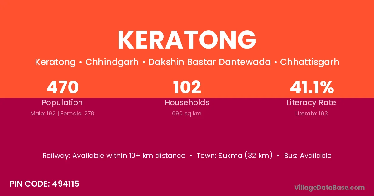Keratong village has a total population of 470 people, of which 192 are males and 278 are females.
