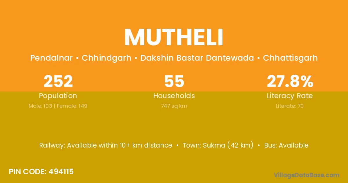 Sukma (42 km) is the nearest town to Mutheli village for major economic activities and is located approximately 42 km away.