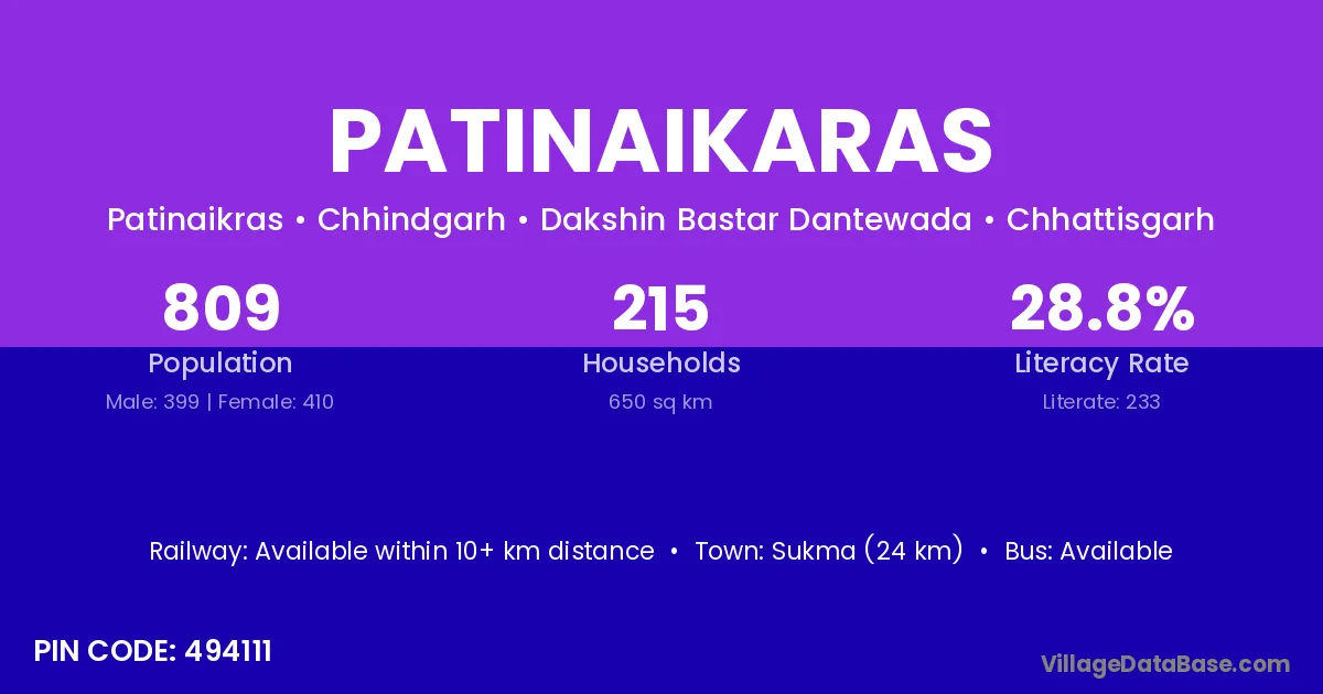 Sukma (24 km) is the nearest town to Patinaikaras village for major economic activities and is located approximately 24 km away.