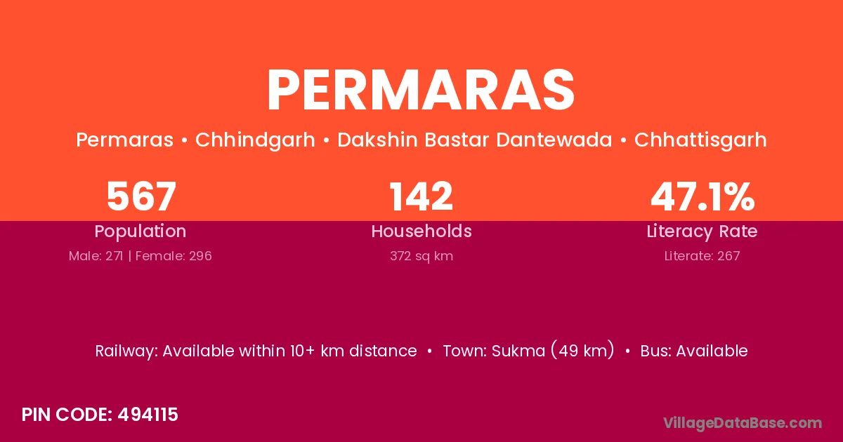 Sukma (49 km) is the nearest town to Permaras village for major economic activities and is located approximately 49 km away.