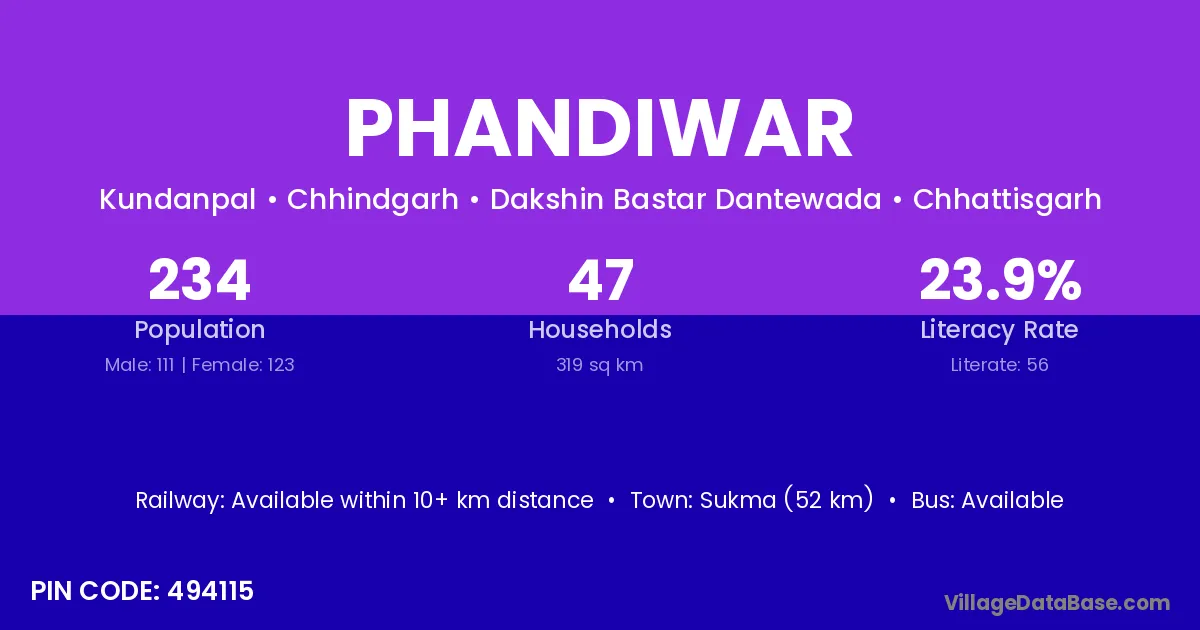 Sukma (52 km) is the nearest town to Phandiwar village for major economic activities and is located approximately 52 km away.