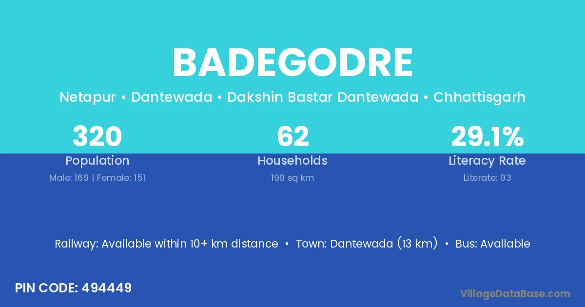 Dantewada (13 km) is the nearest town to Badegodre village for major economic activities and is located approximately 13 km away.