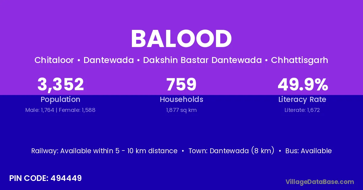 Dantewada (8 km) is the nearest town to Balood village for major economic activities and is located approximately 8 km away.