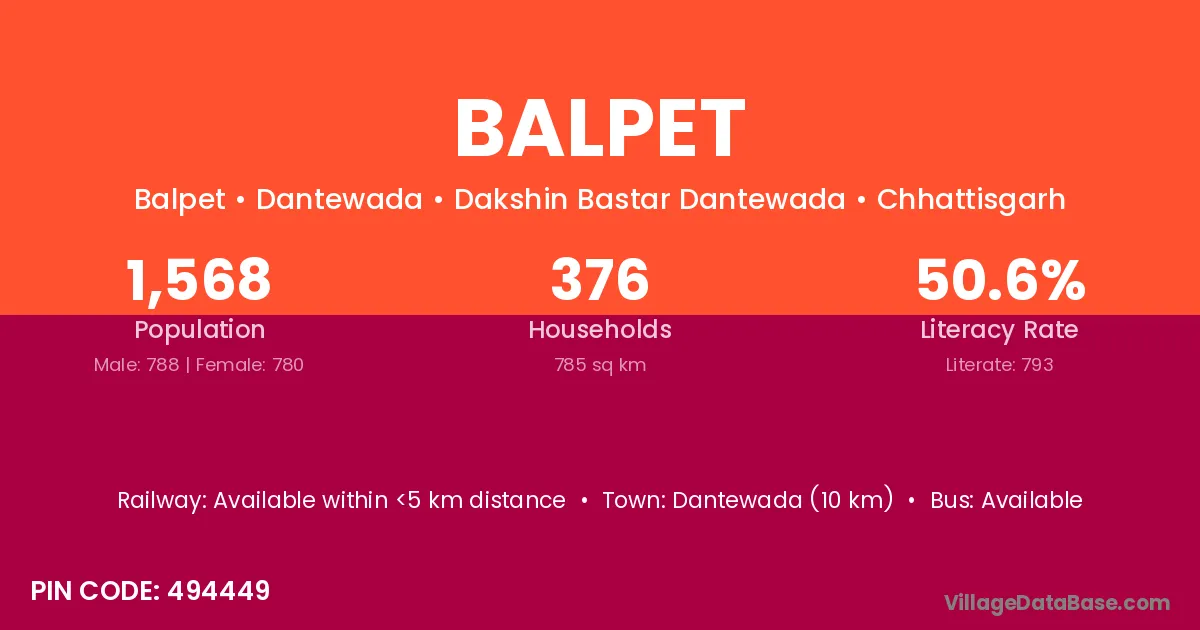 Dantewada (10 km) is the nearest town to Balpet village for major economic activities and is located approximately 10 km away.