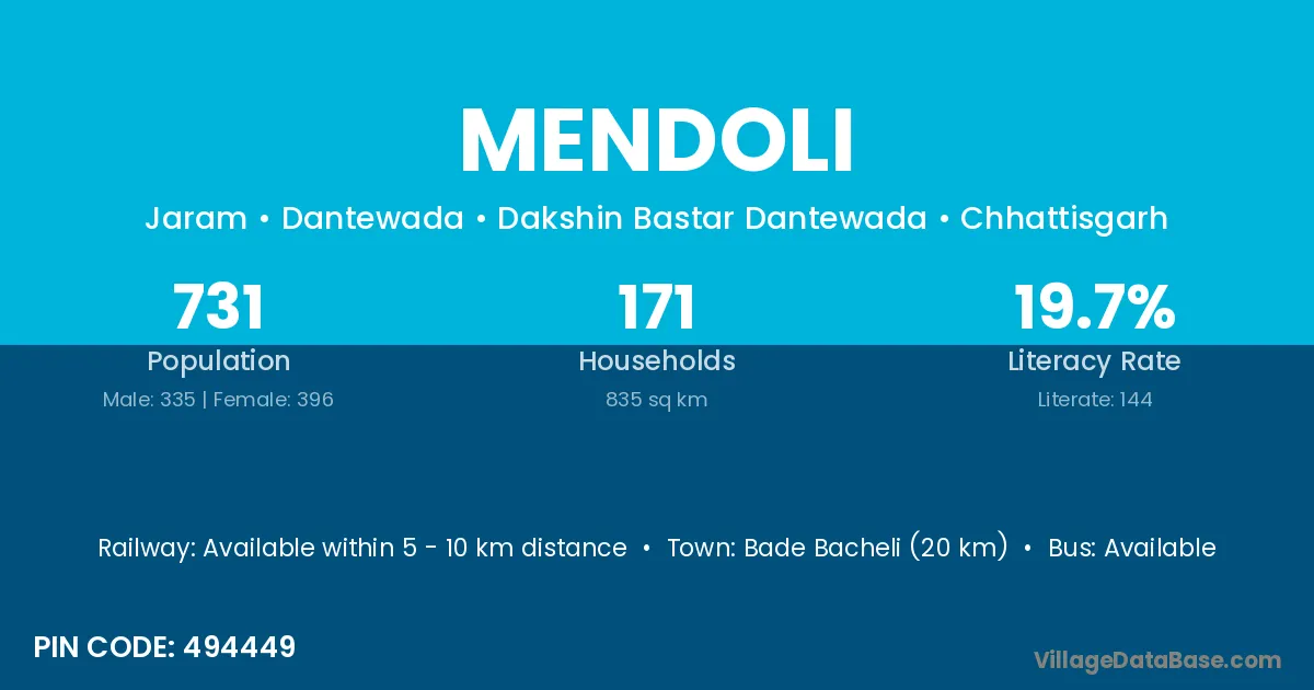 Bade Bacheli (20 km) is the nearest town to Mendoli village for major economic activities and is located approximately 20 km away.