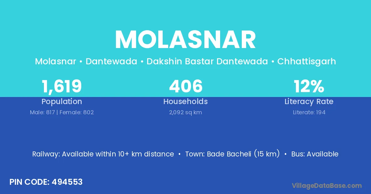 Bade Bacheli (15 km) is the nearest town to Molasnar village for major economic activities and is located approximately 15 km away.