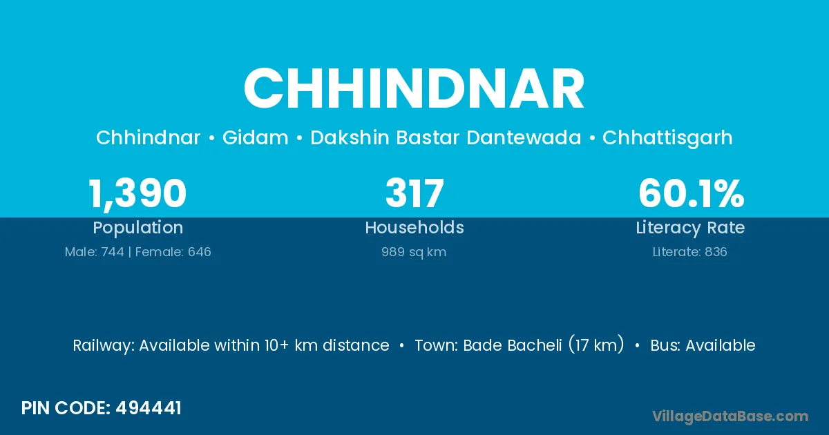Bade Bacheli (17 km) is the nearest town to Chhindnar village for major economic activities and is located approximately 17 km away.