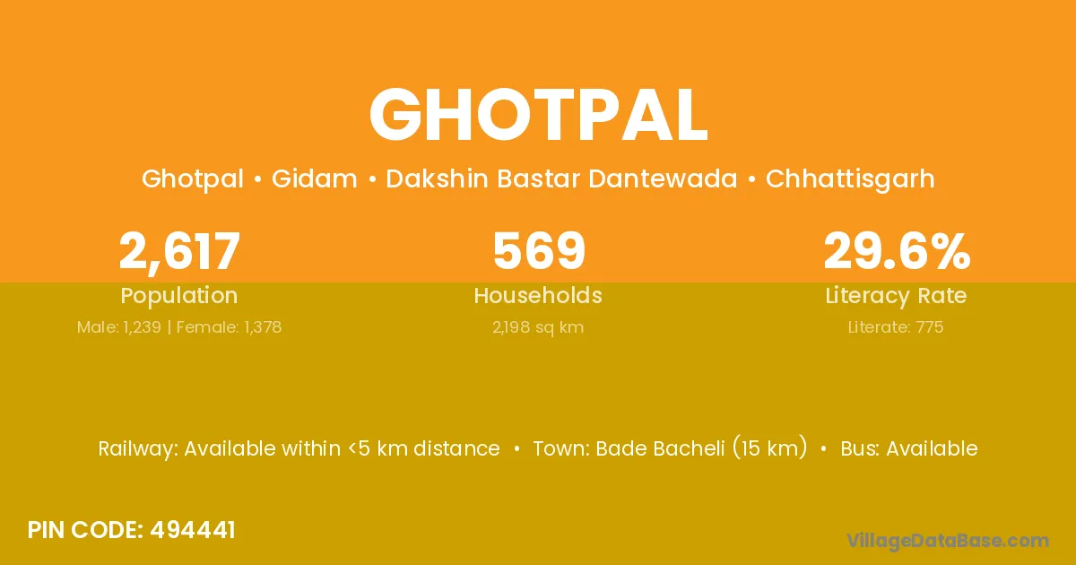 Bade Bacheli (15 km) is the nearest town to Ghotpal village for major economic activities and is located approximately 15 km away.