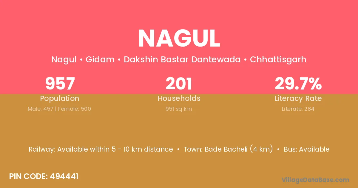 Bade Bacheli (4 km) is the nearest town to Nagul village for major economic activities and is located approximately 4 km away.