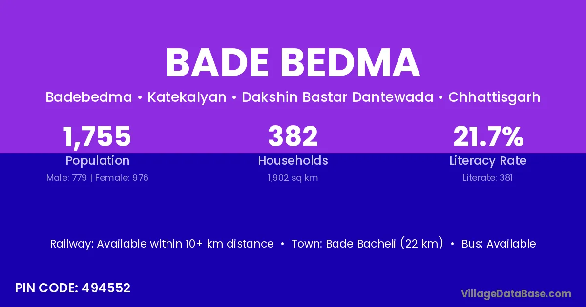 Bade Bacheli (22 km) is the nearest town to Bade Bedma village for major economic activities and is located approximately 22 km away.