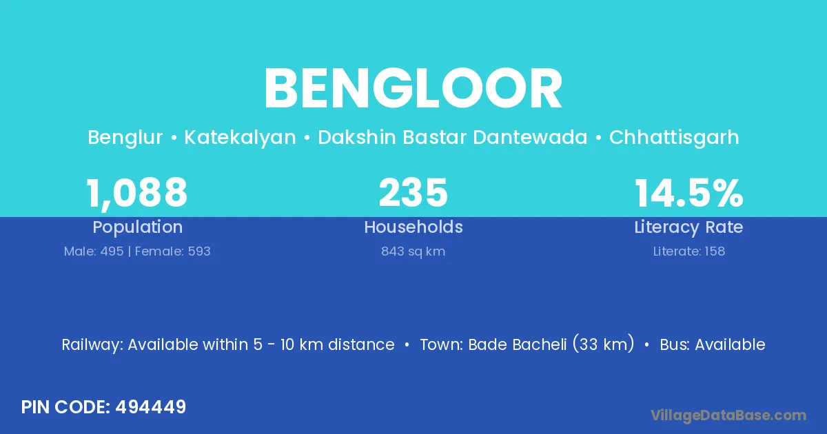 Bade Bacheli (33 km) is the nearest town to Bengloor village for major economic activities and is located approximately 33 km away.