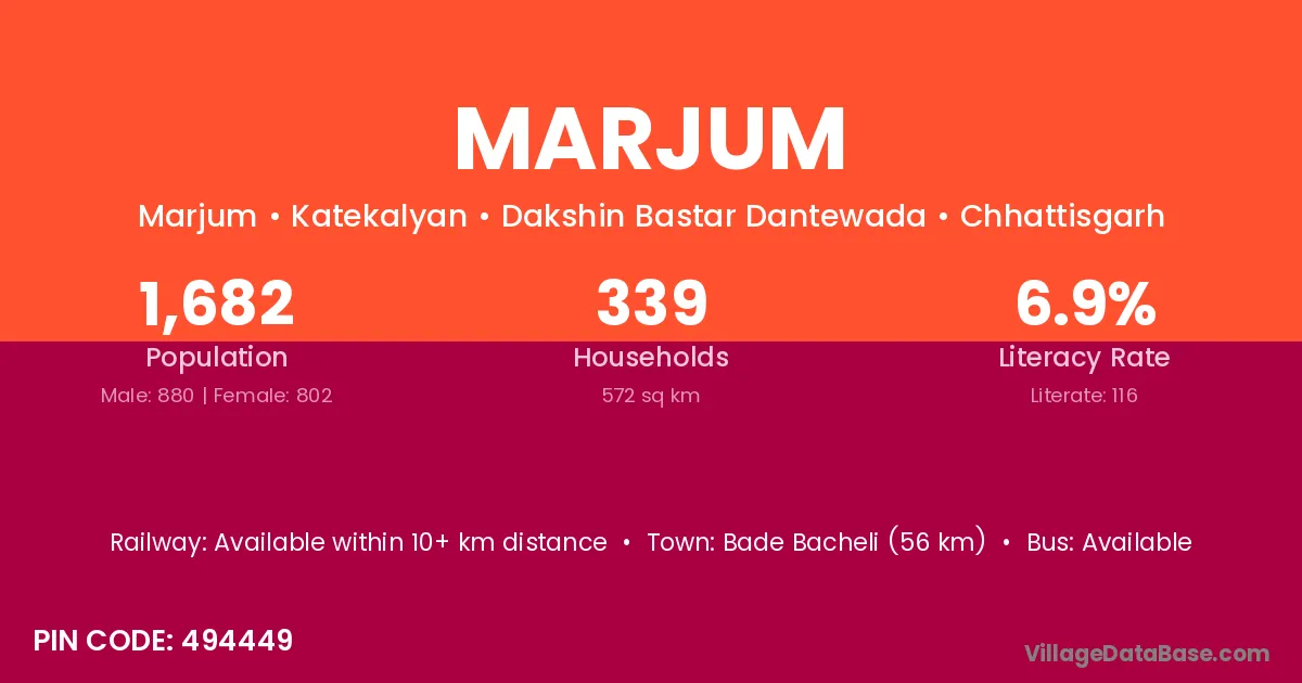 Bade Bacheli (56 km) is the nearest town to Marjum village for major economic activities and is located approximately 56 km away.