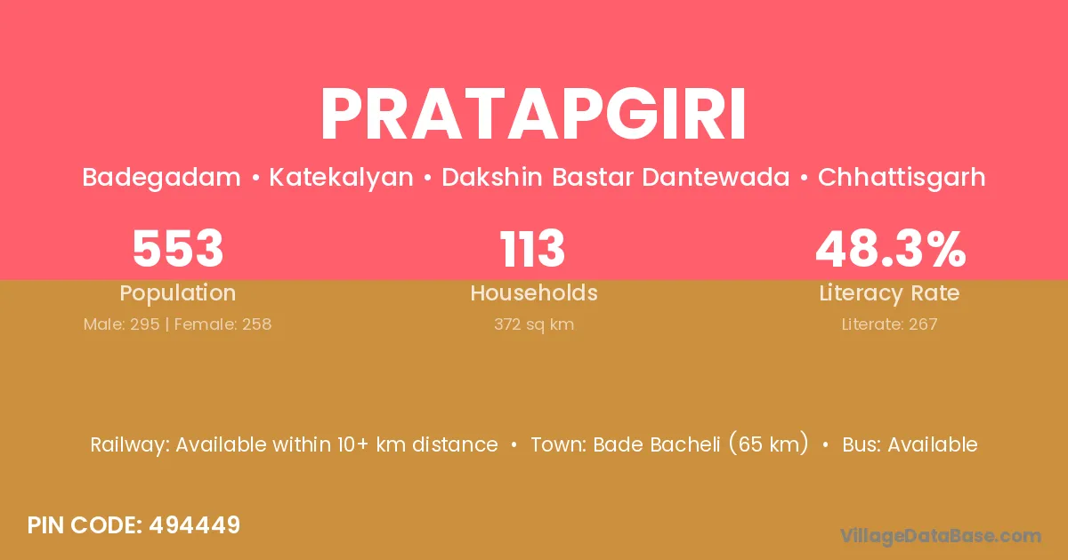 Pratapgiri village has a total population of 553 people, of which 295 are males and 258 are females.