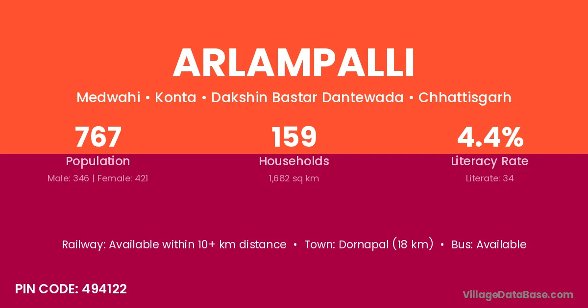 Dornapal (18 km) is the nearest town to Arlampalli village for major economic activities and is located approximately 18 km away.