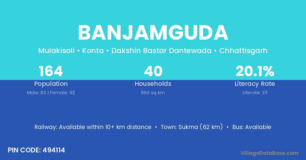 Sukma (62 km) is the nearest town to Banjamguda village for major economic activities and is located approximately 62 km away.