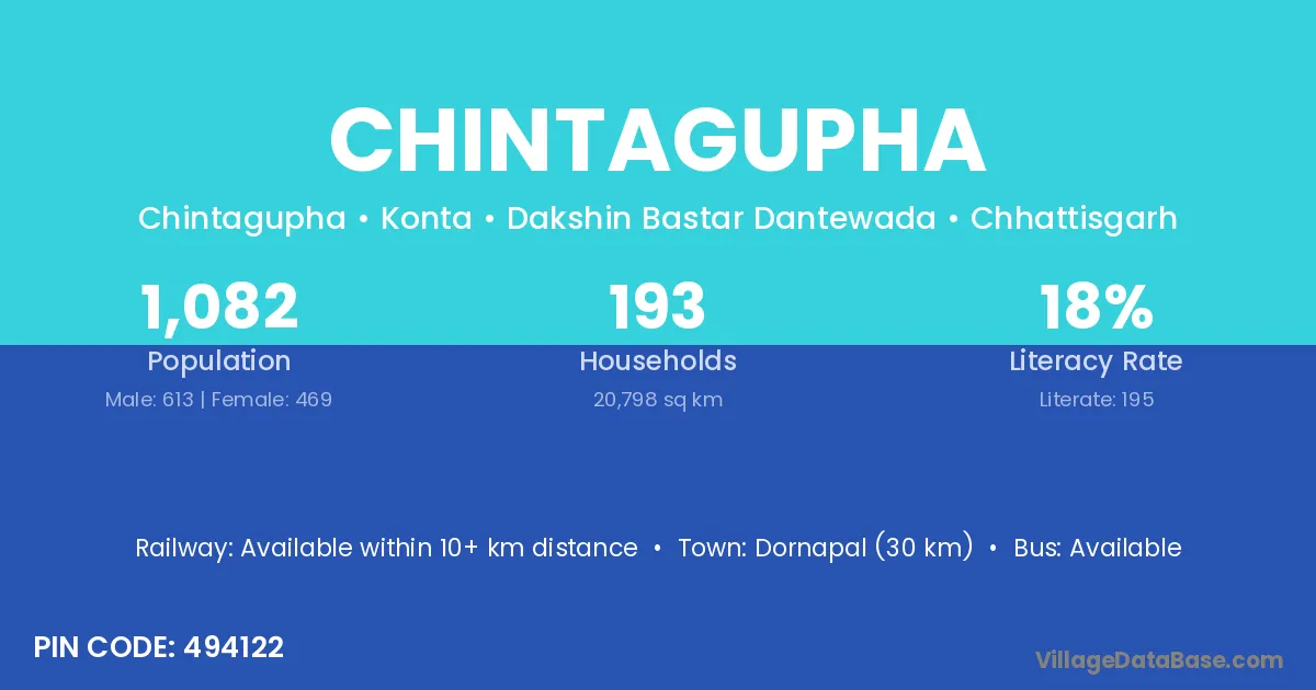 Dornapal (30 km) is the nearest town to Chintagupha village for major economic activities and is located approximately 30 km away.