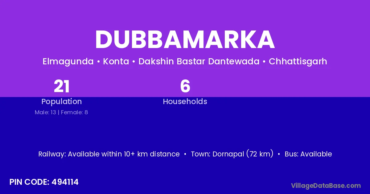 Dornapal (72 km) is the nearest town to Dubbamarka village for major economic activities and is located approximately 72 km away.