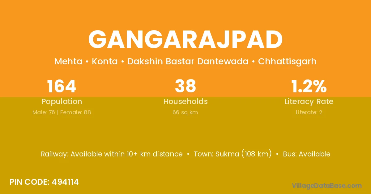 Sukma (108 km) is the nearest town to Gangarajpad village for major economic activities and is located approximately 108 km away.