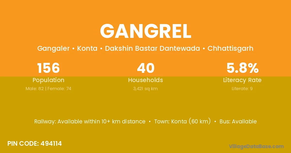 According to Census 2011 information, the village code of Gangrel village is 494114.