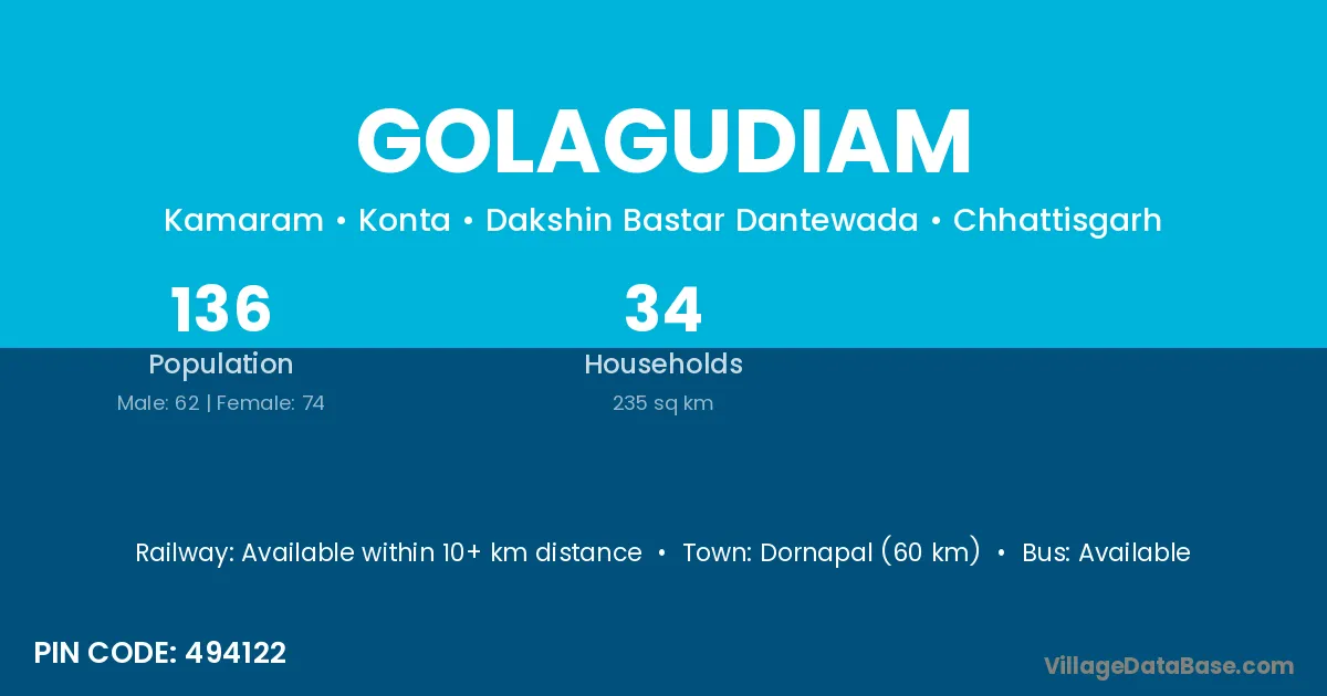Dornapal (60 km) is the nearest town to Golagudiam village for major economic activities and is located approximately 60 km away.