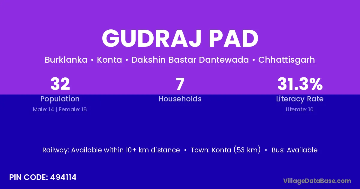 According to Census 2011 information, the village code of Gudraj Pad village is 494114.
