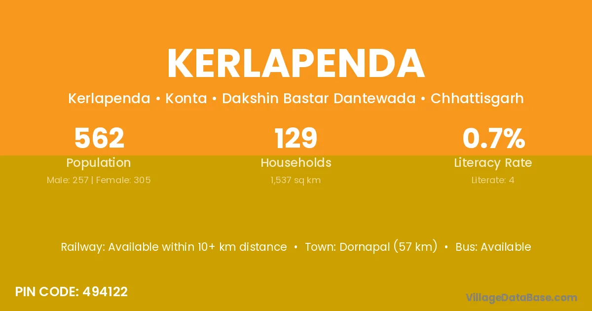 Dornapal (57 km) is the nearest town to Kerlapenda village for major economic activities and is located approximately 57 km away.