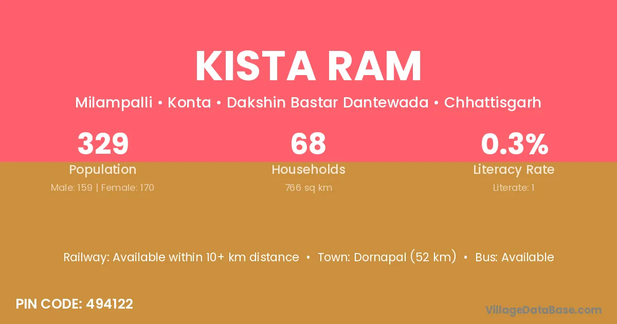 Dornapal (52 km) is the nearest town to Kista Ram village for major economic activities and is located approximately 52 km away.