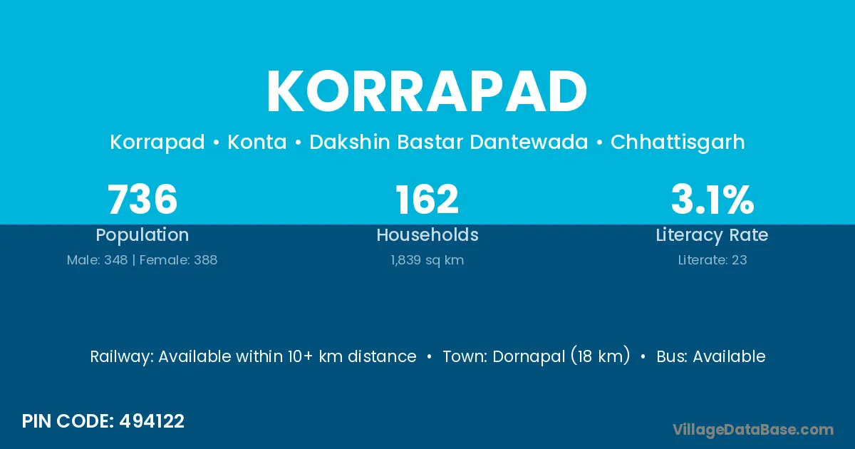 Dornapal (18 km) is the nearest town to Korrapad village for major economic activities and is located approximately 18 km away.